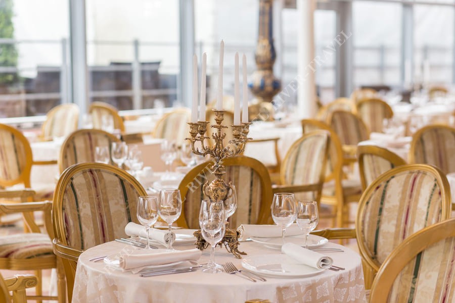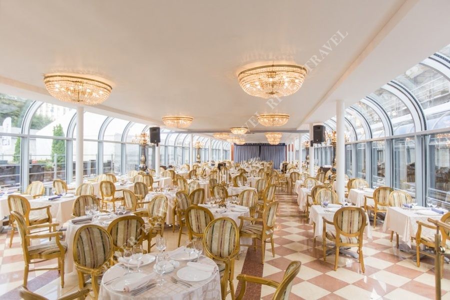 На нижней палубе – роскошный ресторан с изысканным декором. Благодаря огромным панорамным окнам, простирающимся от пола до потолка, вы не пропустите ни единой детали речного путешествия.